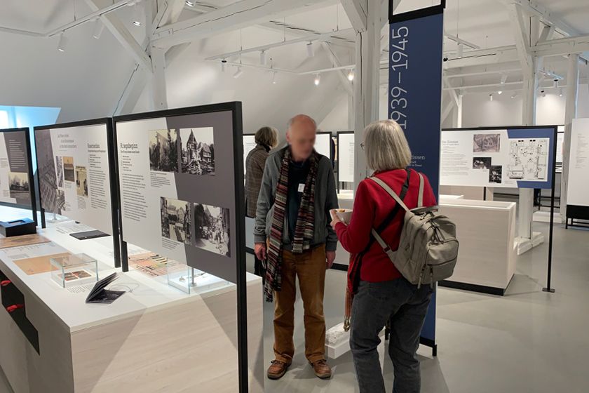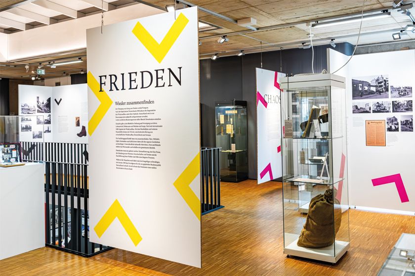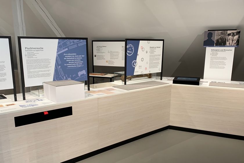 Das Obergeschoss der Kaserne mit Ständerwerk und Schrägen bot einige Herausforderungen. Thekenelemente mit Bild-Texttafeln gliedern den Raum, während Biografiestelen persönliche Geschichten nahebringen. Eine interaktive Station und Medienstationen mit Film, Audios und Informationen ergänzen die Ausstellung.