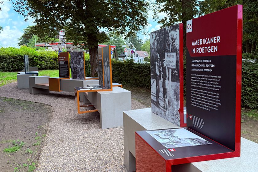 Am 2. September 1944 überschritten hier US-Truppen die Grenze des deutschen Reiches. Somit war Roetgen die erste vom Nazi-Terror befreite deutsche Ortschaft. Daran erinnert dieser neue Ort gegen das Vergessen. Die von gestaltungskomitee entwickelten in Anlehnung an den Westwall Betonelemente mit Schrägen, die in der Grafik dezent aufgenommen werden. Darauf wird mit Fotos, großen Schautafeln und gut lesbaren Texten die lokale Geschichte lebendig. Die kräftigen Farbakzente lenken den Blick auf sich. Ein QR-Code lädt ein zur Web-App mit Filmen, Audiofiles und vertiefenden Informationen in vier Sprachen.