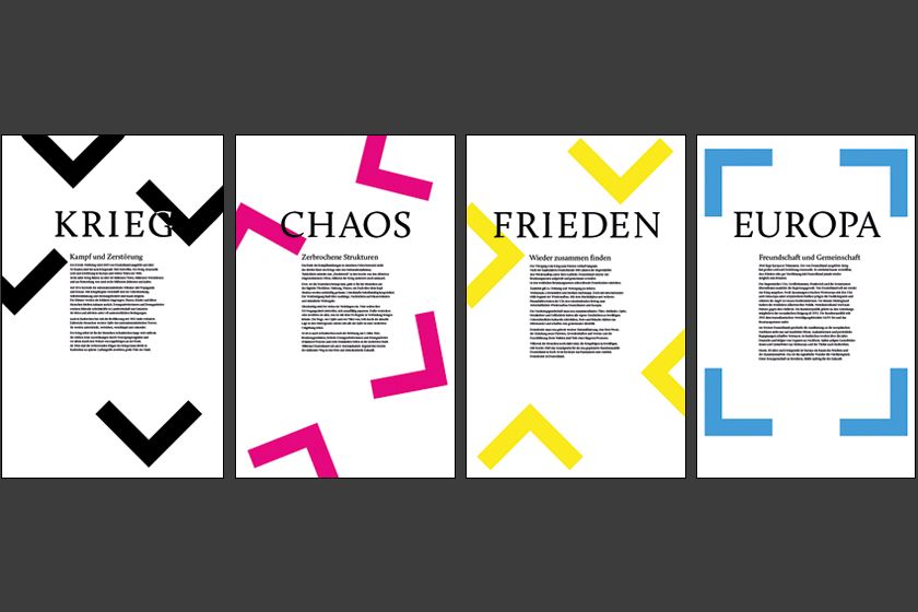 4 Winkel – im Grunde ein dekonstruiertes Hakenkreuz – sind die Basis des Gestaltugskonzeptes, kombiniert mit den Druckfarben cmyk. Je nach Kontext und Position bekommen sie eine andere Aussage. Krieg – hier fallen die schwarzen Winkel wie Bomben von oben herab. Chaos: willkürlich fliegen magentafarbene Winkel von allen Seiten her. Frieden: von außen aufeinander zu gehende gelbe Winkel finden wieder zueinander. Europa: cyanfarbene rechte Winkel geben Ordnung, ohne einzuengen.