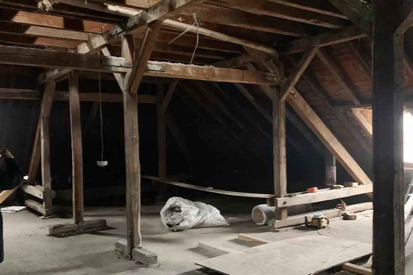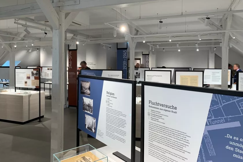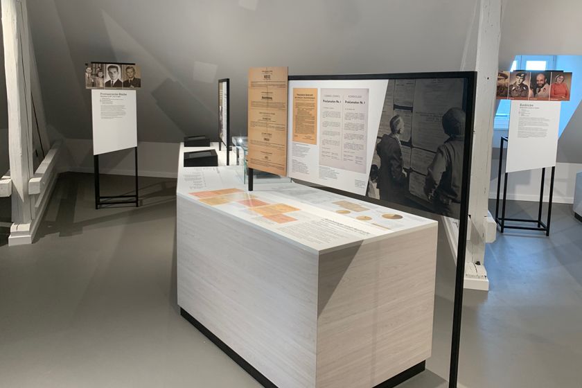 Das Obergeschoss der Kaserne mit Ständerwerk und Schrägen bot einige Herausforderungen. Thekenelemente mit Bild-Texttafeln gliedern den Raum, während Biografiestelen persönliche Geschichten nahebringen. Eine interaktive Station und Medienstationen mit Film, Audios und Informationen ergänzen die Ausstellung.