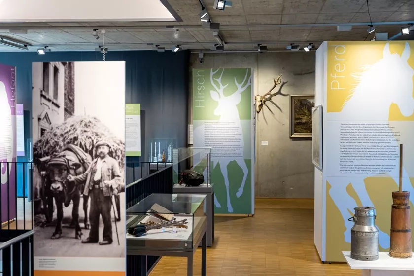 Frischen Farben und große Silhouetten führen durch die Ausstellung und konstrastieren gut mit historischen Fotos und Exponaten. Die durchdachte Themenverteilung erlaubt eine materialsparende Umsetzung auf wenigen Folien und recycelbaren Tafeln aus Wabenkarton.