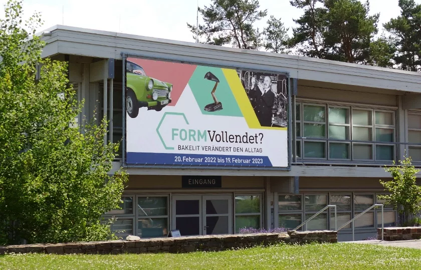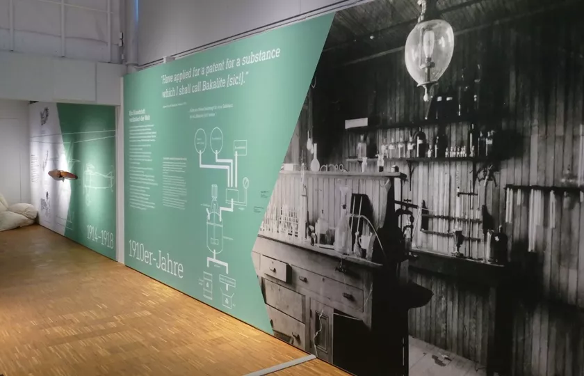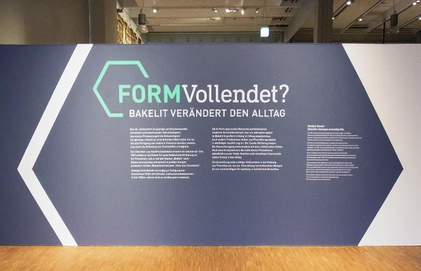 Der Benzolring, Teil des Bakelitmoleküls, ist das verbindende Gestaltungselement der Ausstellung. Die frische Farbigkeit gibt den Bakelit-Exponaten einen guten Rahmen und lockert den Raum auf.