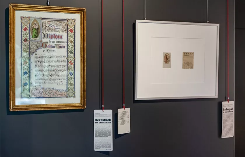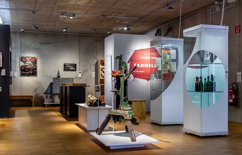 Das Stadtmuseum zeigt seine Schätze: Ausgewählte Objekte stehen für Euskirchener Geschichte, flankiert von Texten zum Thema Erinnern, Sammeln und Sammlung. Bestandsmobiliar wurde umgenutzt und ergänzt und die für alle erreichbaren Karten am „Roten Faden“ erzählen mit Bild und Text die spannenden Geschichten hinter den besonderen Exponaten. Der dazugehörige Katalog greift die Gestaltungselemente der Ausstellung auf.