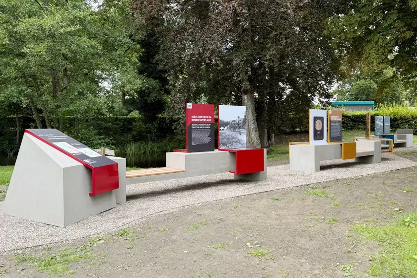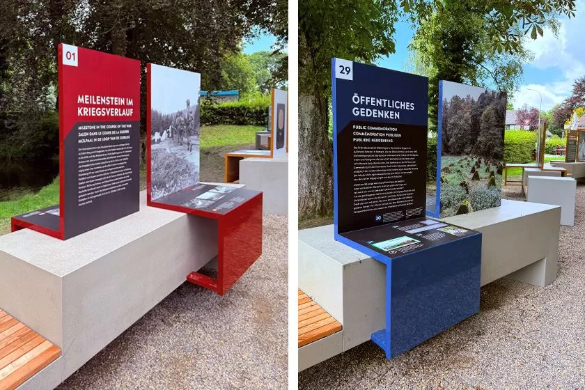 Am 2. September 1944 überschritten hier US-Truppen die Grenze des deutschen Reiches. Somit war Roetgen die erste vom Nazi-Terror befreite deutsche Ortschaft. Daran erinnert dieser neue Ort gegen das Vergessen. Die von gestaltungskomitee entwickelten in Anlehnung an den Westwall Betonelemente mit Schrägen, die in der Grafik dezent aufgenommen werden. Darauf wird mit Fotos, großen Schautafeln und gut lesbaren Texten die lokale Geschichte lebendig. Die kräftigen Farbakzente lenken den Blick auf sich. Ein QR-Code lädt ein zur Web-App mit Filmen, Audiofiles und vertiefenden Informationen in vier Sprachen.